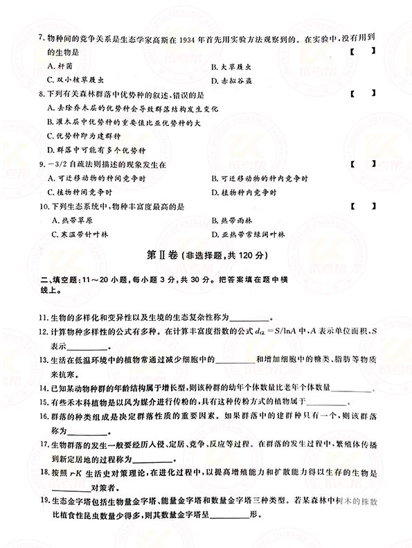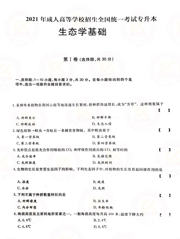 以上是关于2021年江西成人高考专升本生态基础学真题及答案相关内容,想获取更多关于江西成人高考的相关资讯,如江西成人高考专升本试题、准考证打印、成考答疑、分数线、报考条件、报名时间、考试科目、成绩录取查询等,敬请关注江西成考网