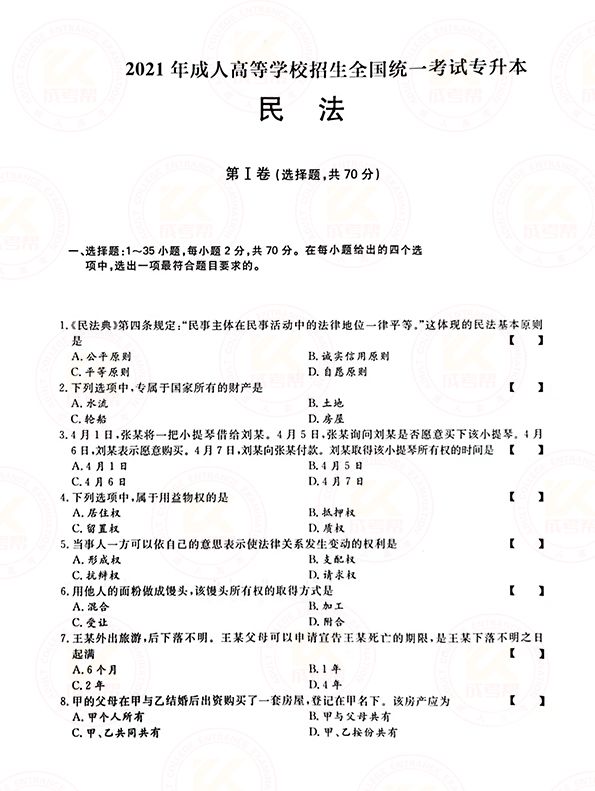 以上是关于2021年江西成人高考专升本民法真题及答案相关内容,想获取更多关于江西成人高考的相关资讯,如江西成人高考专升本试题、准考证打印、成考答疑、分数线、报考条件、报名时间、考试科目、成绩录取查询等,敬请关注江西成考网
