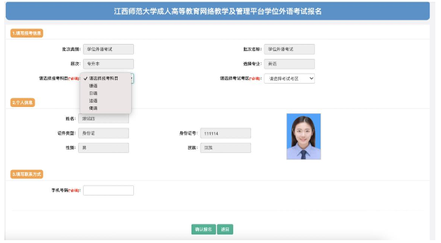 点击报名,英语专业(含商务英语专业)的学生在报考科目中可选择德语、日语、法语和俄语,非英语专业(含商务英语专业)的学生选择英语即可,考区选择对应的教学点进行参与:其余数据默认同学籍中的数据保持一致,如有变更,请先联系教学点老师确认并提交信息变更相关材料进行变更。待考场安排完成后,11月30日-12月2日,可进行准考证打印下载,查看个人考试安排数据信息。