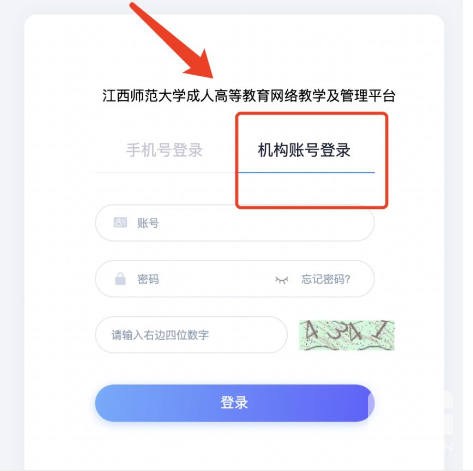 1、登录页面:请选择【机构账号账号登录】,然后在此页面中输入账号、密码;初始账号为学号,初始密码为edu@身份证后六位,如遇字母需大写。