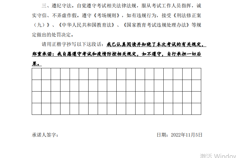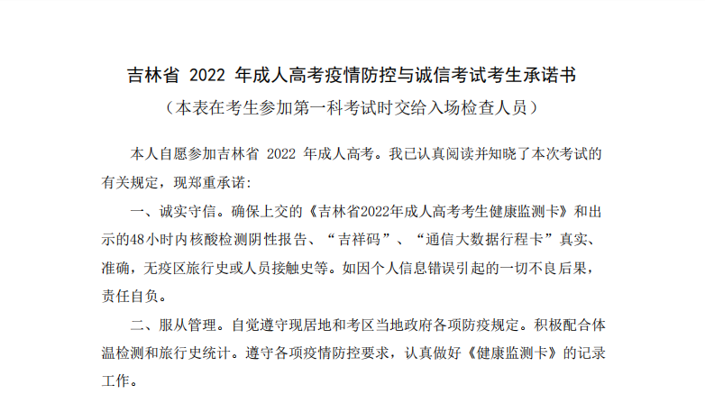 点击下载文件:吉林省2022年成人高考疫情防控与诚信考试考生承诺书.pdf
