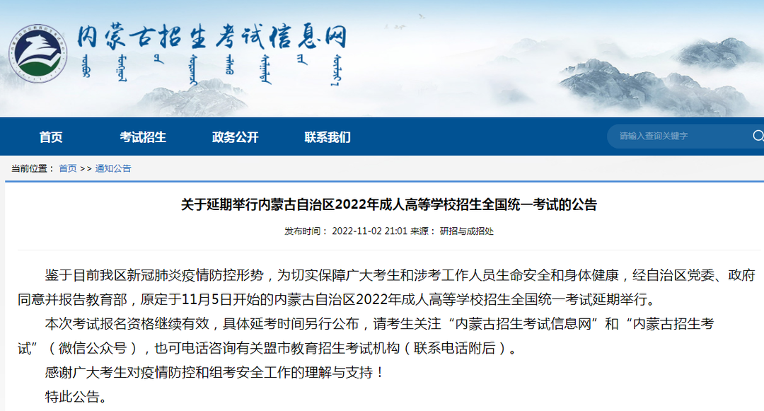 原定于11月5日开始的内蒙古自治区2022年成人高等学校招生全国统一考试延期举行。